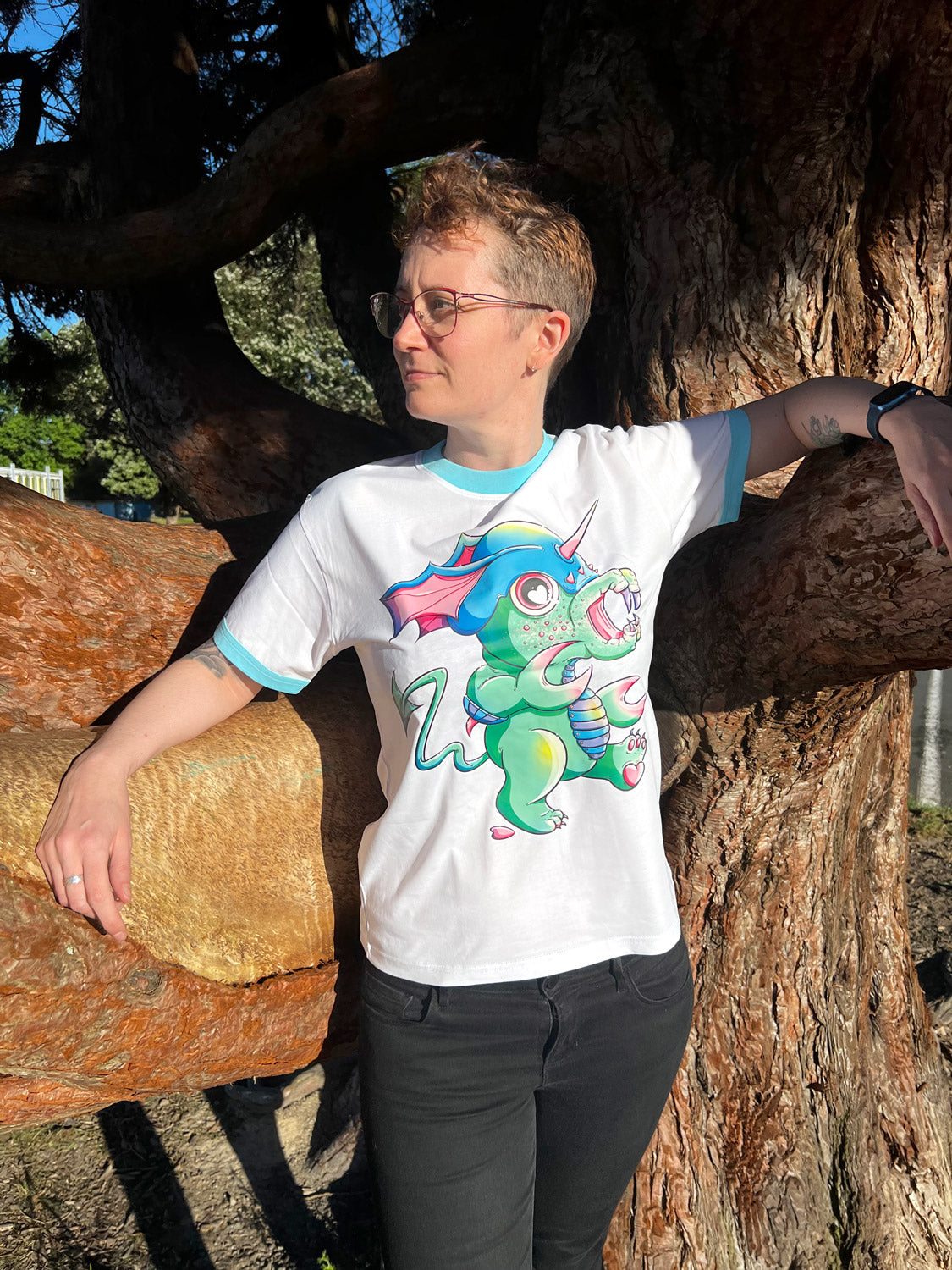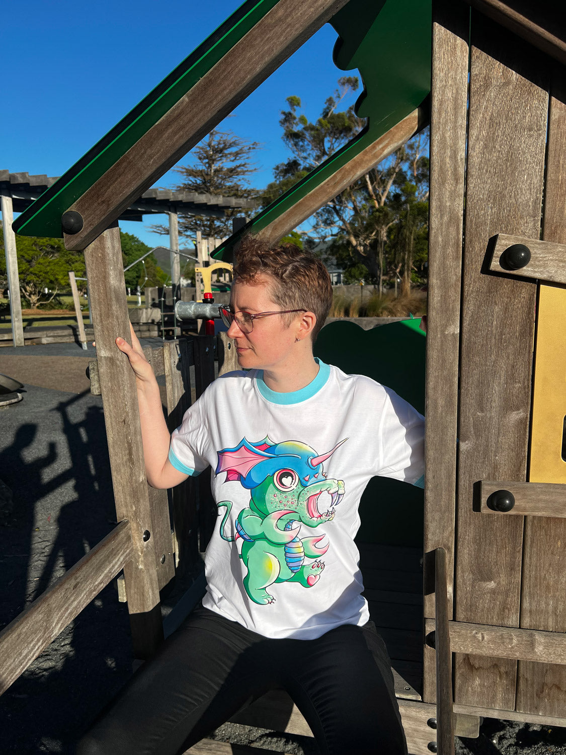 Made from 100% soft white cotton and trimmed with pastel-blue ribbing on the neck and sleeves, this shirt blends kawaii charm with just the right hint of monster magic. The direct-to-film front print brings one of our strange little creatures to life, bright, bold, and impossible to ignore.