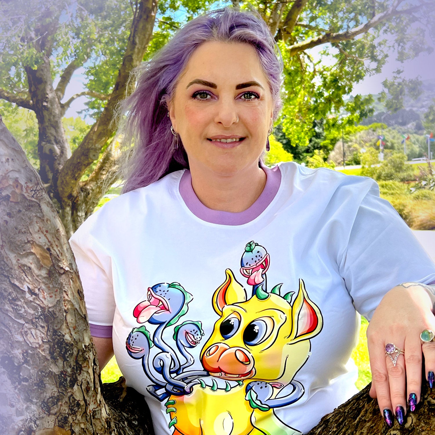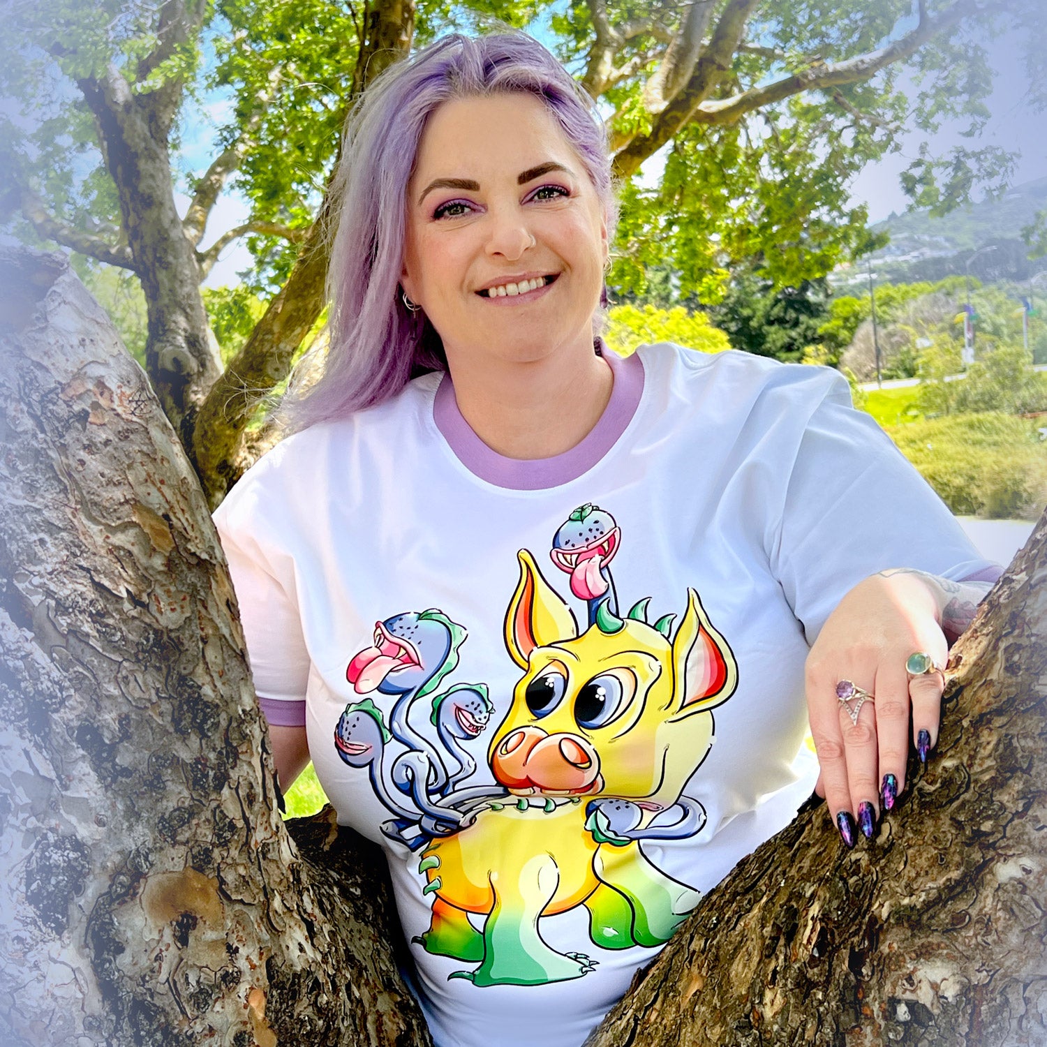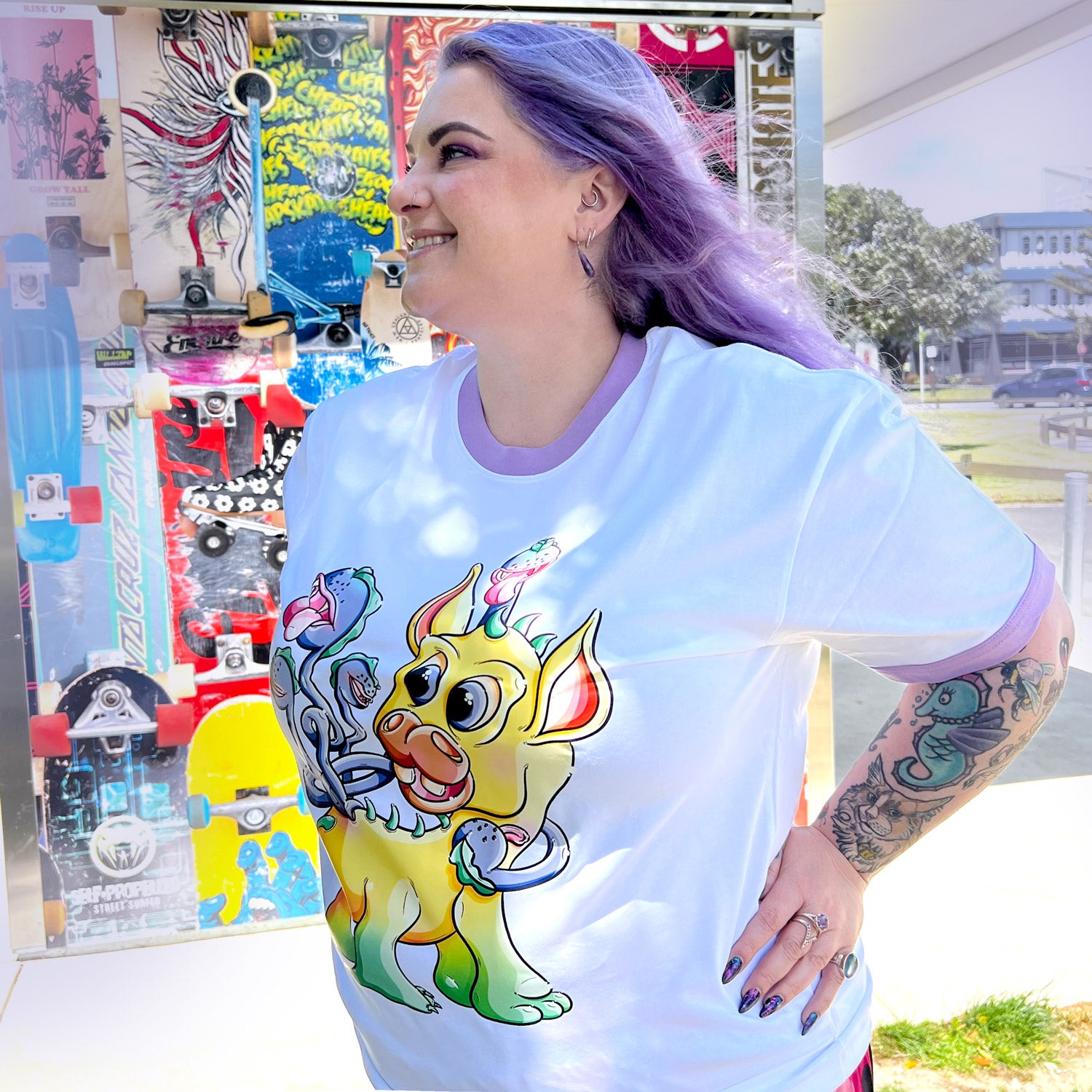 Made from 100% soft white cotton and trimmed with yellow ribbing on the neck and sleeves, this shirt blends kawaii charm with just the right hint of monster magic. The direct-to-film front print brings one of our strange little creatures to life, bright, bold, and impossible to ignore.